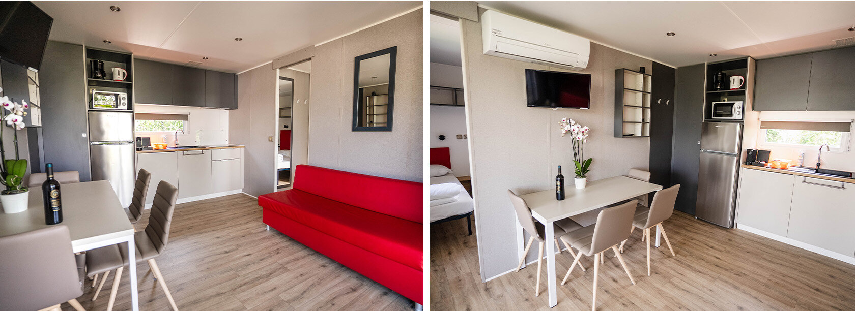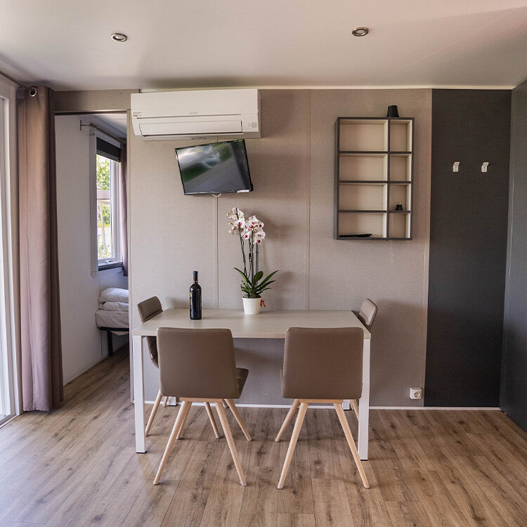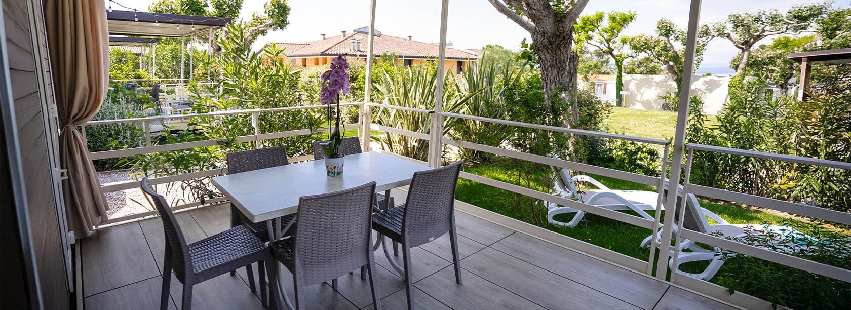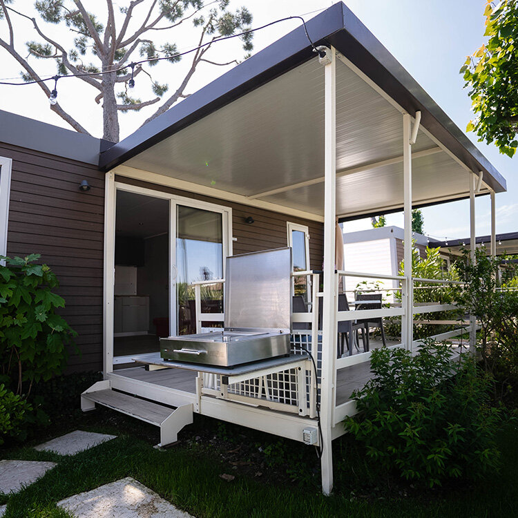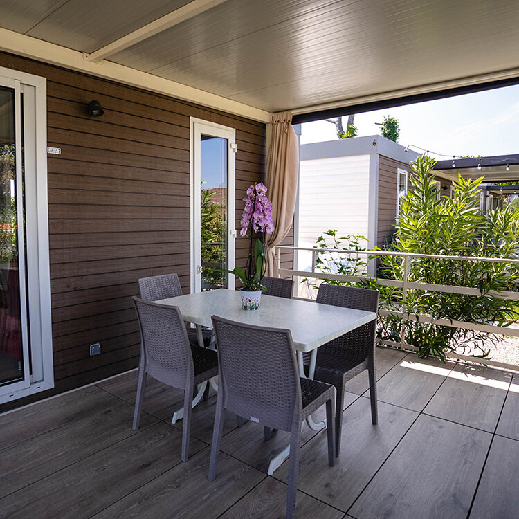Helt nye mobilehomes udstyret med alle bekvemmeligheder og omgivet af naturen. Terrassen er udstyret med bord og stole med udsigt over en stor have med to komfortable liggestole og en grill. Ferieboligen tilbyder al den komfort der skal til for at få en ferie med total afslapning.