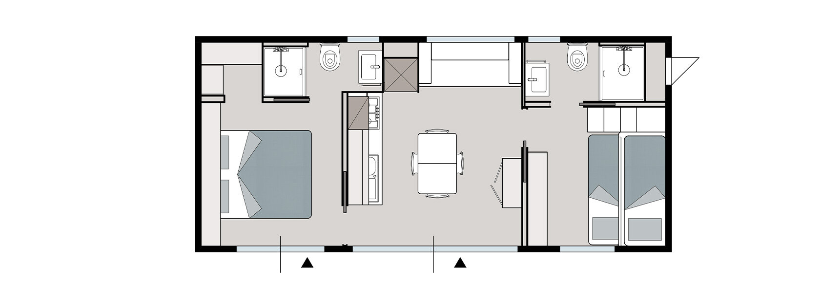 Olivi Hydro Extra består af: soveværelse med dobbeltseng, børneværelse med køjeseng, badeværelse med bruser og opholdsstue. Opholdsstuen har bord, sofa, LCD-tv og køkken. I køkkenet er alle nødvendige apparater tilgængelige for husets fulde autonomi: køleskab, induktionskomfur, mikroovn og opvaskemaskine. Udenfor findes et privat grønt område på 9 kvm, en overdækket terrasse og spabad til 4 personer.